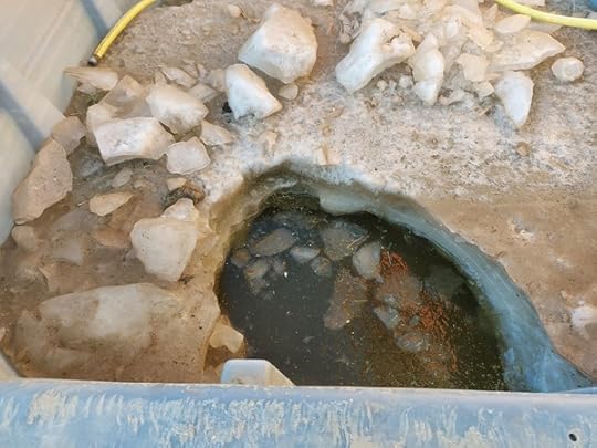 And of course, whenever we go away, especially in the winter, some dumb thing happens. This time, our back tank heater died, so we have melted a new one through the ice to begin to thaw the 6 inches of ice. Maybe by Saturday we will be able to pull the old one out.