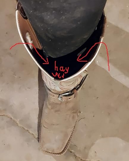 There is a ginormous gap between my boot top and my leg. Sawdust, branchlets, and hay bits fall in as if that space were a black hole exerting irresistible gravitational force.