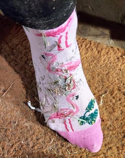 The flamingo socks were a gift from Faith! They are fun to wear when not coated in grass and alfalfa!