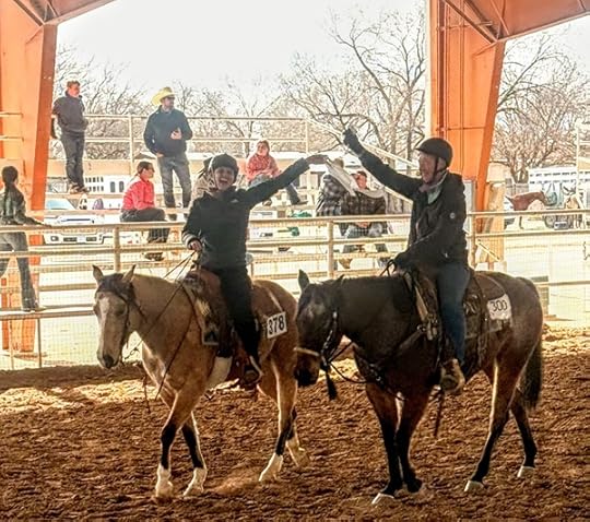 Monica’s granddaughter, Hadleigh, also put in a full day with her horse Eli, whose name, in my head, is Rio. Don’t ask me where my brain came up with that! Hadleigh showed just about everything possible, except cows, and those are coming. Rio–I mean Eli–came to them as a failed reiner whose previous owners didn’t think much of him. We all think they were wrong. He has tended to get a bit overwrought when reining, but he and Hadleigh really click. They put together a steady, pretty, and correct reining pattern with no drama at all and they looked quite good English as well!