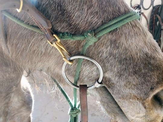 Rope halter and web halter. The chain and the bit are in her mouth and she is perfectly fine. No gumming the bit or any signs of discomfort. I have two halters on her so I can have the lead rope on the green halter so as not to pull on the bit or chain attached to the red halter. And she accepted them so nicely! On 2/22 anyway…