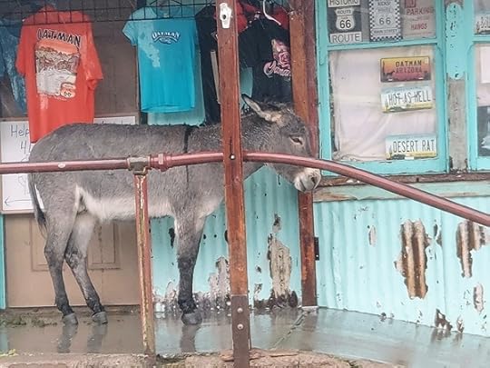A burro hanging out on a boardwalk in Oatman to get out of the rain!