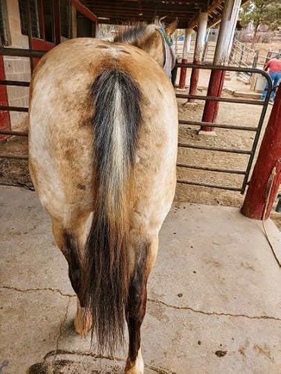 March, 2025. LT is 15! Her tail is barely black at all! She is still looking fairly buckskin, but her coat does seem lighter than the March 2014 photo.