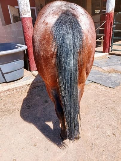 LT has just one copy of the LP gene and her body color, while getting more white hairs over time, has not “roaned out” like other horses we have. The place I can really see the depigmentation effects is in her tail!