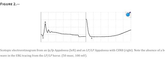 The presence of the A wave and lack of the B wave in the LP/LP horses indicates that the rods (cells that detect light in low conditions) are working (A wave), but that the signal can not get to the next level or the brain (lack of B wave), so the rod system fails.