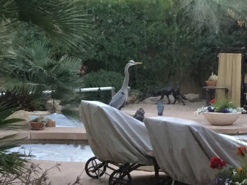 4 lines (8 lines permissible)12 syllables per line divided as 7-5make a pause space between the 7 and 5 syllablesuse comma, caesura or kireji (cutting word) as the pauseno rhymesno meterno end of line pauses – the whole should flow together as though one long sentenceThe Imayo is a literal poem so do not use symbolism, allegory etc.I decided to write about the Great Blue Heron that showed up in my yard last year. In the photo, the coyote behind the heron is an inanimate metal coyote!
