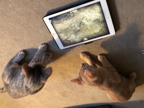 Cute kitties below are my daughter’s kittens, but this photo is already months old! They are playing Mouse for Cats on my iPad.