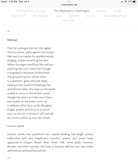 The journal The Ekphrastic Review hosts an Ekphrastic (writing inspired by a work of art) Challenge every two weeks. Here is a poem I wrote to one awhile back. The link will take you to a sample of the art by Manuel Espinoza, though not the actual piece I used. https://www.ekphrastic.net/the-ekphrastic-challenges/manuel-Espinosa-ekphrastic-writing-responses