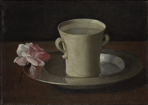 In this portrait of a cup of water, I find my mind focusing on the slivers of light on pewter and pottery. I have to be directed to see the large shadow on our right that is so obvious once pointed out. Then I note its power. The water looks refreshing enough to dive into if only I could make myself smaller like Alice. In fact, I feel myself becoming both smaller as the scene looms bigger in front of me and also larger as the space in my mind that this painting inhabits grows. Eventually I have to recognize the two aspects that poke at me, pay attention to me, they say. One is the fantasy flower with petals so curvy they could be dying or so unreal as not to include thorns. The other is the handles of the cup are misshapen. They don’t match, and only a child’s fingers could enter their spaces. Only a fantasy child like Alice.