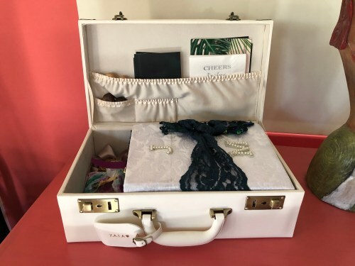 I had to find this nifty little suitcase after I realized that with the fragility of the book (cuz junk) and their lifestyle the book wouldn’t last long without protection. I was able to add in their wooden ring boxes, little place cards, extra photos, and the napkins from their previous courthouse wedding where we drank blue prosecco and ate cookies. Last year’s wedding was the whole shebang because that’s what they like.