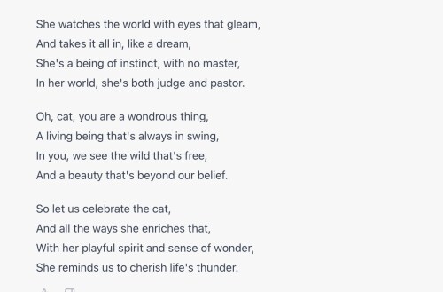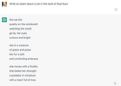 Yesterday I posted about asking the new Microsoft ChatGPT to write a blog post about art journaling. I felt a little sad that it could produce a decent freshman essay. But then Amy at https://brotmanblog.com/2023/01/10/time-for-a-break-2/ challenged me to ask it to write a poem. So I decided to have it write poems in the styles of different poets. I asked for a poem about a cat in the styles of Rupi Kaur (who writes simple little ditties that are very popular on Instagram), Sylvia Plath, Walt Whitman, and Luanne Castle (haha). [You see that haha right there? ChatGPT would never do that!]