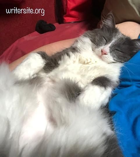 For anybody who doesn’t know, by the way, Perry is the kitty who showed up in our yard in spring 2017 seeming completely feral. I worked so closely with him (reading, singing, reciting poetry, holding his food bowl while he ate) that he got over his extreme fear of humans and showed himself to be the most amazing cat EVER (and that is saying something since I was “mom” of the amazing cat Pear Blossom and have been mom to many cats). One of the many Perry highlights: Perry lies on his back nestled in my arm like a napping toddler.