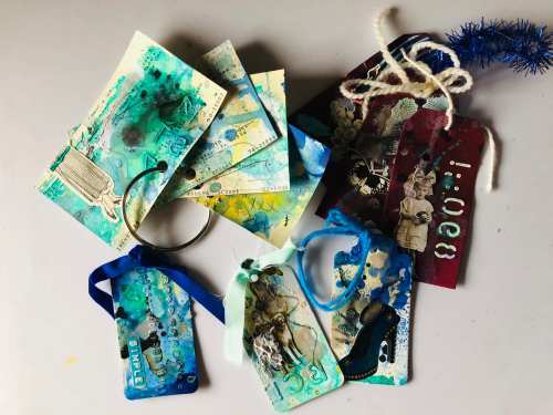 These are some tags I made for the first “water” prompt at The Ugly Art Club. Yup, still doing art journalling. I am starting to find little things about my “style.” It’s been slow coming, but–for instance–the half woman (skirt half) in the top library card. I like using women’s skirts. Go figure.