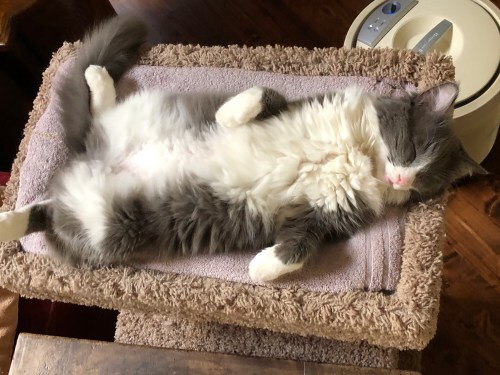 Back to the echo we didn’t have at that time. Sure wish we had done it. Turns out now his heart is very bad. Three of the four heart chambers are enlarged, and he might have a hole in his atrial septum. He is so ill from his heart that the vet says it’s a moot point whether he has IBD or lymphoma. He also tests positive for the feline coronavirus (which causes FIP) so it’s possible it’s behind his illnesses. He will begin two new medications as soon as we receive them from the compounding pharmacy.