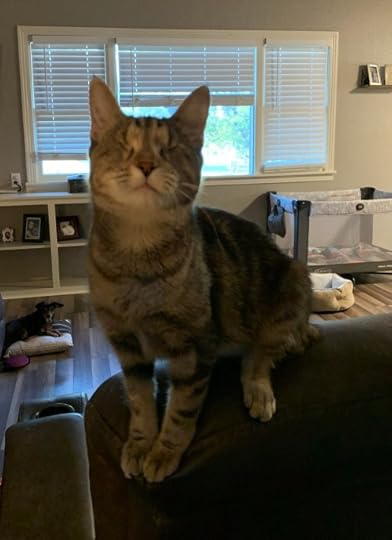 Lucky is 14, and her name comes from the fact that she was the lucky one of her litter who survived being thrown out of a car. Moxie and Pixie were also found on the road kittens, and they are now 4. Pixie is a tortie, and boy does she let you know it. Strut and Poppet came in as medical fosters. Strut suffered some type of blunt force trauma to his face and leg, and was having seizures when we got him as a foster. He lost an eye, and one of his legs is crooked, and he’s a klutz, but he is the sweetest boy. He was up for adoption, but the right family never came along, so now he’s one of the crew. Poppet came in with horribly infected eyes, and we had to have both of them removed. She was also up for adoption, but as with Strut, the right family ended up being ours. Finally we have Charlie. who came up with one of the neighborhood cats as a kitten. We were able to trap him, and he bonded with Strut, who was also a kitten at the time, so he became a permanent member of the family. They live with Baxter, Bandit, and Dobby, our three rescue dogs.