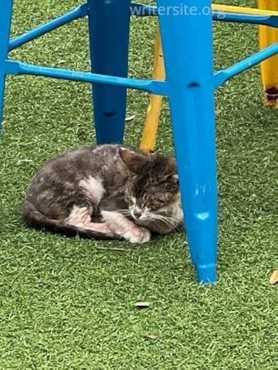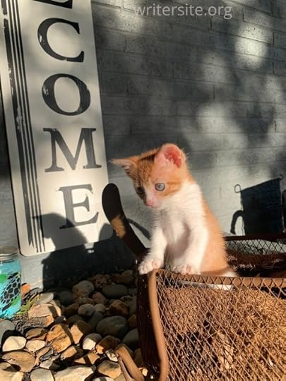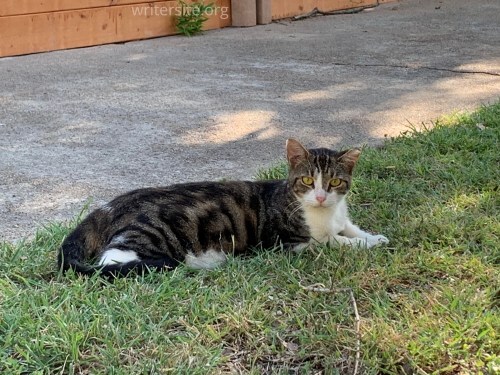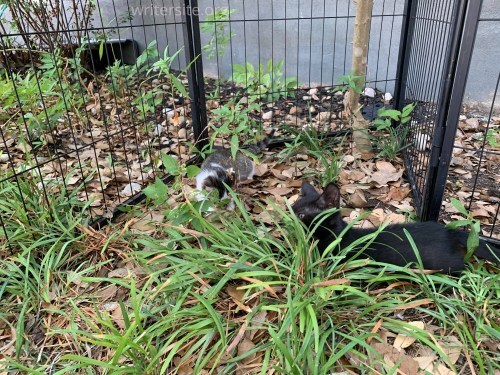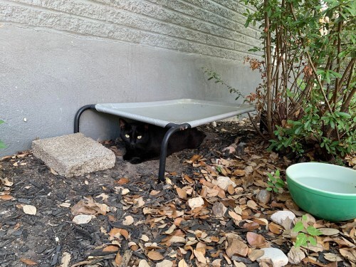Poppet today!There are the “permanent” colony cats – Bear, Jr., Jester, Jon Snow, Pirate, Shimmer, Waco (the infamous mange cat,) Goldeneye, and Jax (another mange cat from Waco.) While normally Waco and Jax would have returned to their colony after they recovered, but the colony they came from has lots of medical issues, so the decision was made to allow them to stay with my colony. There are also the neighborhood cats who are regulars – Curly Tail, Floof Tail, Swirl, Hissy, Gigi, Grayson, Blue Eyes. They come and go, although Curly Tail is working his way up to permanent colony member. That just means that he has moved from eating at the feeding station in the side yard, to eating and spending most of his time in Wacoville, which is a designated outdoor living space for the colony cats.