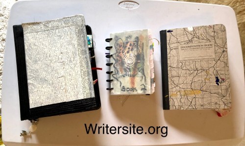 For the first 25 days I used a zippered binder and its “cardstock” dividers. This binder had been left at my house by a previous boyfriend of daughter. For the second 25 days I used an address book. 26 letters of the alphabet is pretty close to 25 days! Then I started a journal that Kasia had recommended as an inexpensive type she likes. It’s a Decomposition Book (hahaha), made of 100% post-consumer-waste recycle pages and printed with soy ink. This one has a topographic map on the cover and graph paper inside. The pages are a bit thin, so sometimes I glue two together. And the gesso helps strengthen them, as well. My big dilemma now is whether I continue in this book or switch to a fourth book. I think I’ll switch because the journal is already getting pretty thick with gesso, paint, collage, fabric scraps, safety pins, and the like.
