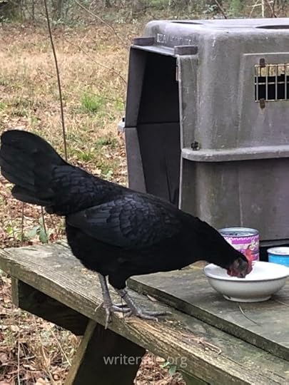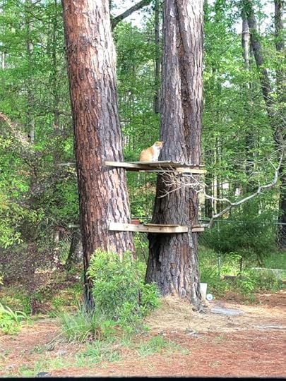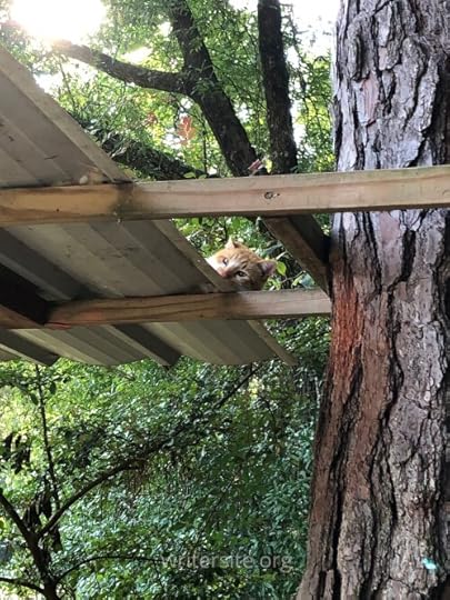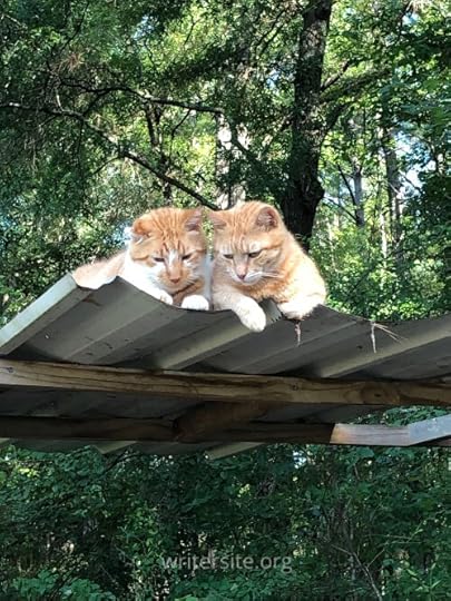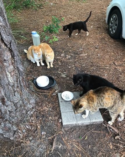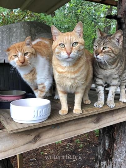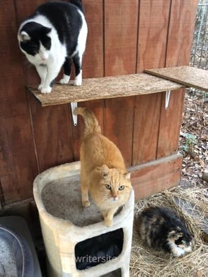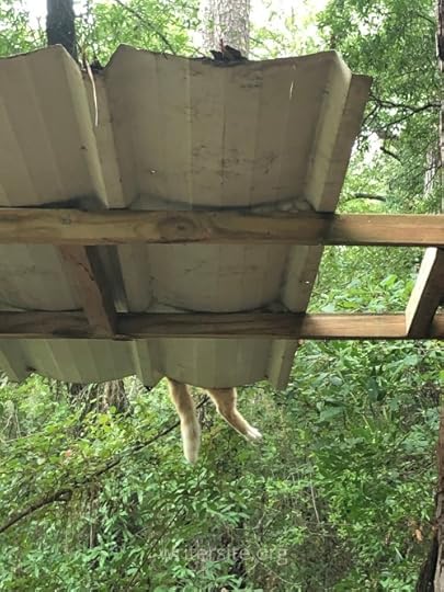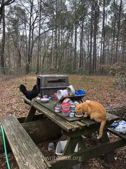 Right now, only the cats and any wild animals like raccoons, opossums, and birds live there. There was a flock of chickens that moved through here almost every day, eating all the food in The Treehouse. They couldn’t be touched, and I don’t know where they came from, but we started buying chicken scratch and chicken feed to put out. They are voracious feeders, and the cats stay out of their way.
