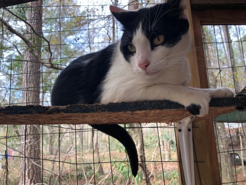 The most surprising and interesting thing is how they separate themselves into groups. The Butter and Basil took over The Treehouse, which was started as just a safe place for cats to go if they ventured outside the fence. Pop-Up and Tortie live in the condo because that’s where they need to be for their own safety. The last four, Georgia, Sue, Joey, and Jersey, live in the general area of the picnic table. There are multiple places for them to sleep, inside and outside the fence. We made what I call the Dormitory outside the fence in the woods about 15 years ago. Sometimes the wild animals sleep there, but the kids here now don’t use it any more.