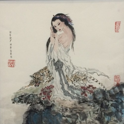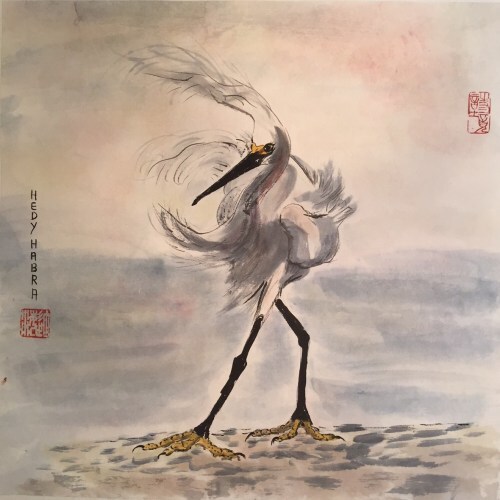 Before I move into her poetry, I’d like to share a couple of her gorgeous paintings: “Dancing Egret” and “Woman & Leopard.”