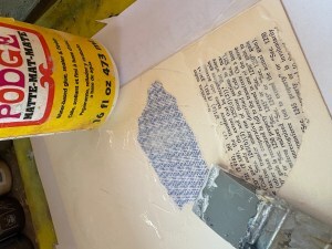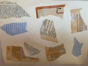 Here are photos from applying the bottom layer of collage. Remember that you don’t have to do this stage. It’s just to give more texture and depth to the piece.