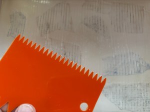When the gesso is wet, you can create a design or not. Here I used something designed for that purpose, but you can use your fingernails, a fork, anything your imagination can come up with.