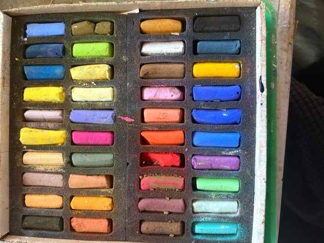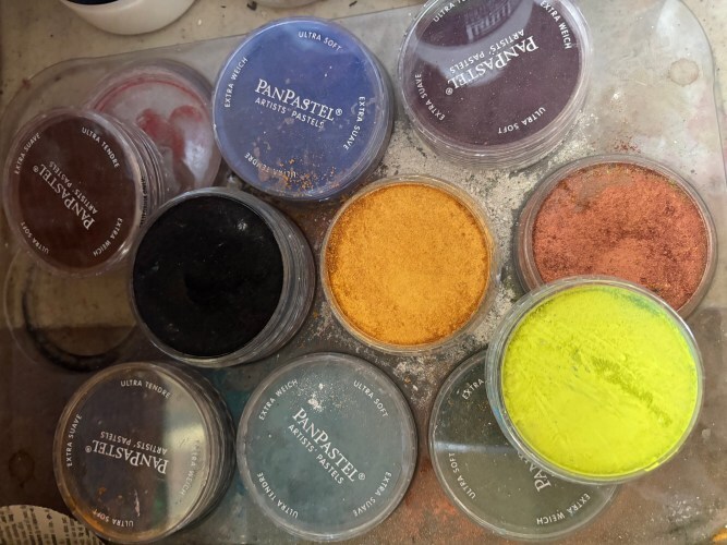 Now we move to the creation of the backdrop that will be seen. Soft, dry pastels. Yum. Here I have some sticks and some “pan pastels.” What I love about this type of pastels is that I can apply them haphazardly and then wet them (with a spray bottle of water) and sponge or baby wipe them in whatever chaos I like. Beware that there are other types of pastels that are impervious to water and cannot be smeared around like this.