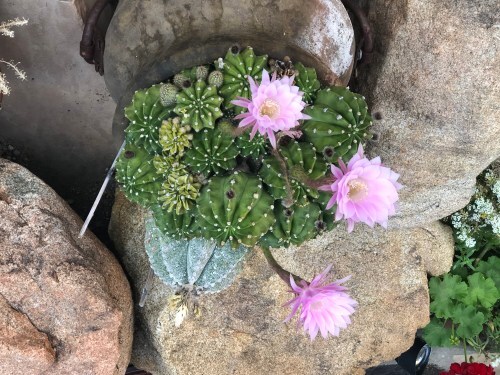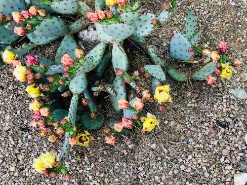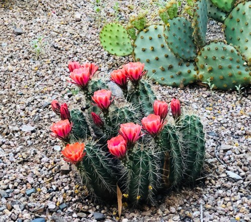In my yard, the cacti are in flower. Each one is spectacular, but my favorite is the coral one. Of course, since coral is my favorite color!