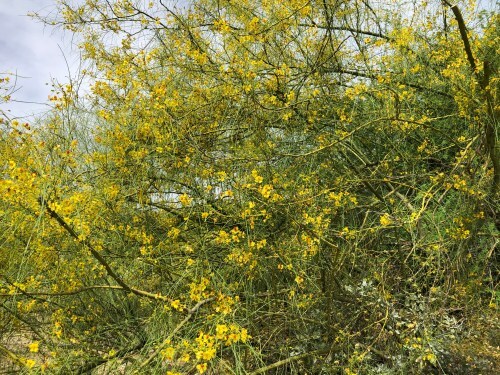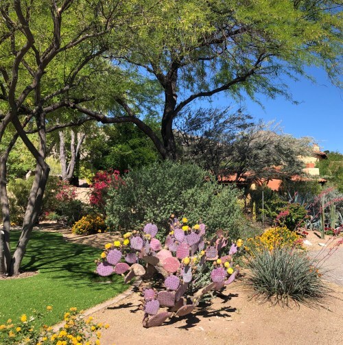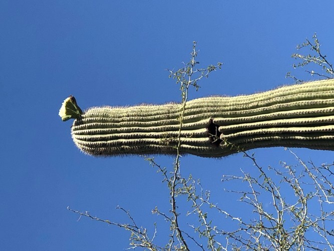 Green and purple hummingbirds were flying in and around the yellow-blooming sweet acacia trees. The palo verde trees’ blossoms are just wiggling out. A songbird slid into a little round hole in a giant saguaro to visit her nestlings. Everywhere I walked I heard various sections of the symphony of birds making music together. I recorded some of it on my phone so I can try to isolate what type of birds I was hearing. On my way back, a family of quail ran quickly across the street to safety, and on the wooden gate to my yard, a baby lizard sunned itself.