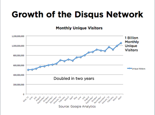 If Facebook is the largest social network in the world with 1 billion+ active users (is that the same as monthly uniques?), and Youtube is the second, I'm pretty sure Disqus can claim to be the 3rd (or are they the 2nd, beating Youtube?). The cool thing about Disqus is they're a social network of blogs and blog readers. In many ways they've become a glue that binds together blogs across the web with actual people and conversations between those people.