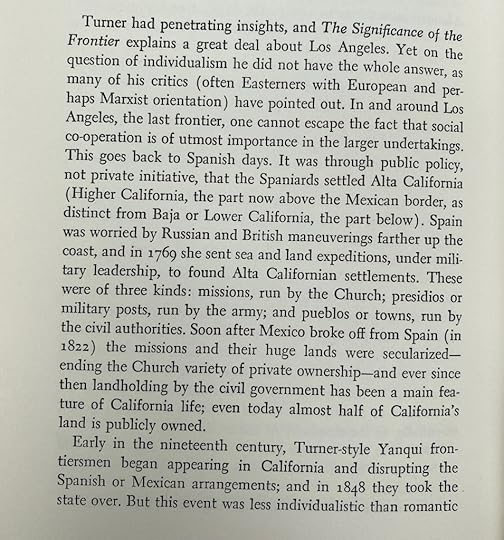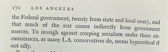 Picked up a used copy of this one, from the genre of New Yorker (the magazine) writers doing longform jobs on big topics. It’s not super insightful or vital in 2023 (“restaurants in L. A. must have plenty of parking space available”) but I appreciated this summary of the socialist history of California: