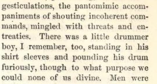 The antic drummer boy sticks in the mind. Shelby Foote may write like he was there, but in the end it’s pretend. Hannaford was there, and what he remembered was a boy pounding away on his drum, “to what purpose we could none of us divine.”