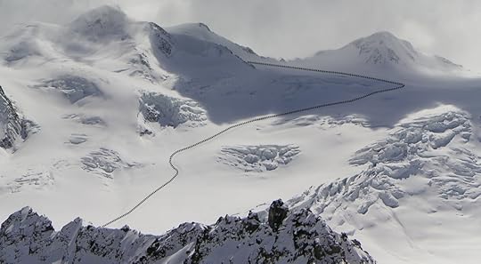 The glacier Taschachferner below the Wildspitze (left, 3.768 m) in Tyrolia in Austria in April 2005. There are some zones with large open crevasses, e.g., the spot-shaped area below the middle of the image and most right. The line marks the ascent track of mountaineers on skis which intentionally avoided these dangerous areas.