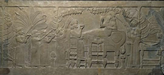 In this relief, created around 645 BCE or so, excavated two thousand four hundredsome years later in 1853 or so in what’s now Iraq, brought to The British Museum, we see the ruler Ashurbanipal lounging and listening to tunes while to the left the decapitated head of Teumman, king of Elam, hangs from a tree.