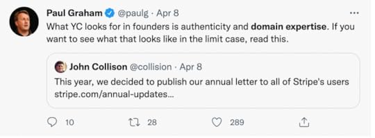 Have been mulling over Paul Graham’s statement here: does this apply to all writing? Think on the compelling novels. Don’t they usually combine authenticity and domain expertise? Even if the domain expertise is gained by a passionate amateur, as in Tom Clancy.