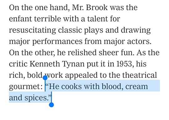 I see that theater director Peter Brook has died. I got a lot out of his book, The Empty Space.