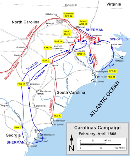 After marching through Georgia, Sherman convinced Grant to let him drive up from Savannah tearing up South Carolina. The Confederate general Joseph Johnston tried to intercept Sherman before he could link up with Grant, but Johnson’s forces were torn to pieces after John Bell Hood’s invasion of Tennessee and the disastrous battles at Franklin and Nashville.
