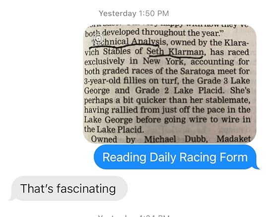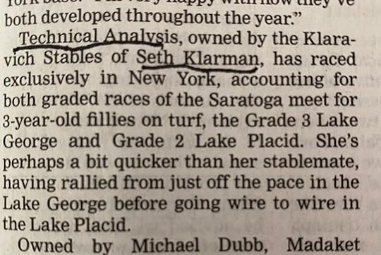 * interesting to maybe four or five people? Seth Klarman is a famed value investor and billionaire, author of Margin of Safety, a used copy of which will run you upwards of $800, or you can go to the Central Branch of the LA Public Library and read it for free. Apparently he’s been in the horse game for some time with a not too shabby record.