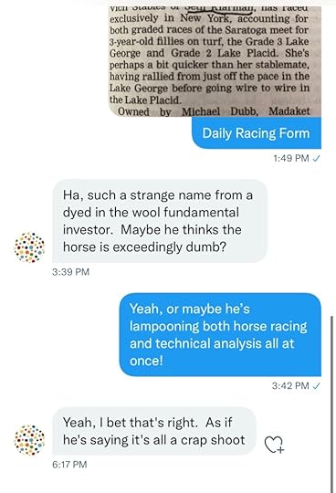 Update: Technical Analysis came in 2nd, so if you’d made a “margin of safety” place or show bet, you would’ve done well: $2 to place paid $4.20, $2 to show paid $3.80. Seth Klarman, teaching us even through horses!