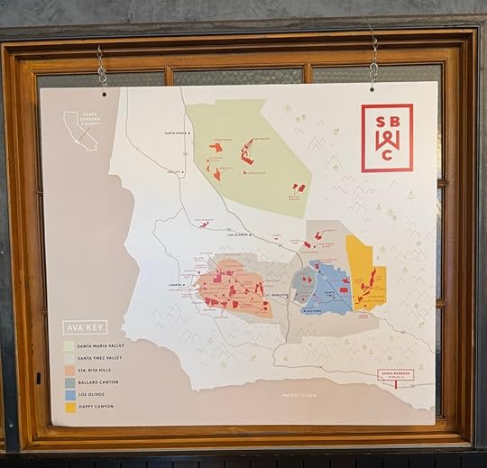 A map of Santa Barbara County on the wall of Helena Avenue BakerySanta Barbara County is vast: 2,745 square miles. If you smooshed down all the mountains and made it flat it would be even bigger. About a third of that is national forest. The population is small: 441,257 residents. Compare that to Norfolk County, MA, which has 727,473 over 441 square miles, and it doesn’t feel exactly crowded. Santa Barbara County thus is remote. Our wine server got to talking about the Santa Barbara Highlands region, where he said there are many beautiful vineyards, but no tasting rooms, and he recommended packing our own food.