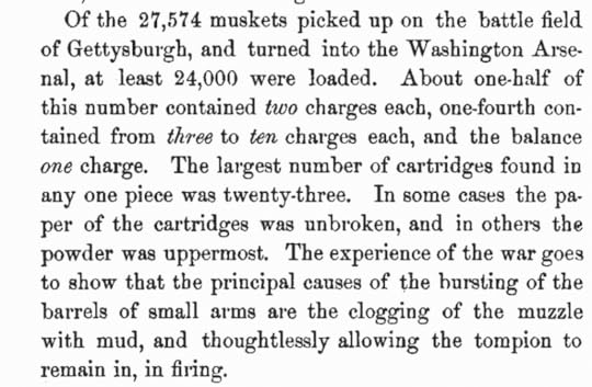 An often quoted set of statistics from Gettysburg has it that the Union forces salvaged 27,574 ‘muskets’ after the battle, of which 24,000 were loaded, including 12,000 loaded twice, 6,000 loaded between three and ten times, one with twenty-three charges and one with twenty-two balls and sixty-six buckshot. Some had six balls and only one charge of powder; others had six unopened cartridges. Others again had the ball behind the powder instead of the other way round.