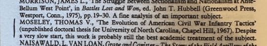 My guy was tracking down unpublished doctoral theses to make his war games as accurate as possible. Despite the somewhat grim subject matter (guys blasting away at each other) learning about Griffith has uplifted my feelings about human nature and the power of curiousity. For those without any particular passion for the subject Griffith’s cover illustration probably tells you everything you need to know about a Civil War battle, although ironically no source is listed beyond “Cover Design by Maggie Mellett”.