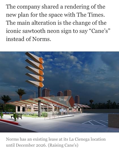 I read that Norms on La Cienega, a classic LA diner, may be replaced by a Raising Cane’s.