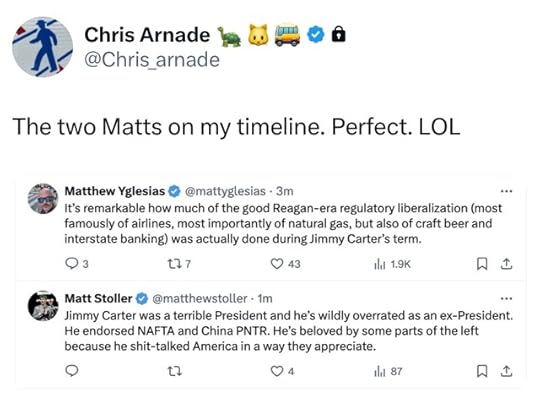 Maybe the biggest way the Carter presidency ripples through daily life in 2025: deregulation. Trucking, rail, airlines, natural gas. Southwest Airlines, Wal-Mart, Amazon, the shale boom, none of these would be the same without Carter-era deregulation. The consequences are many and mixed, and the result may not have matched the vision. The main stated goal was to fight inflation, massive problem and major part of Carter’s undoing.