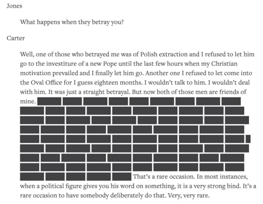 The book is great by the way, I was very absorbed. Something I should learn more about would be Carter’s relationship to unions, organized labor. In Passage of Power Caro, reporting on LBJ’s first presidential weekend mentions several calls with labor leaders like Walter Reuther. By the next Democratic presidency I hear almost nothing about labor. Jimmy was a business owner, manager and employer. Georgia was not a union friendly state. Maybe there’s a bigger story to be told about the collapse of US labor power between 1963 and 1976. Maybe Carter is a part of that story.