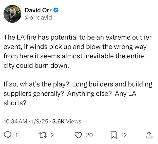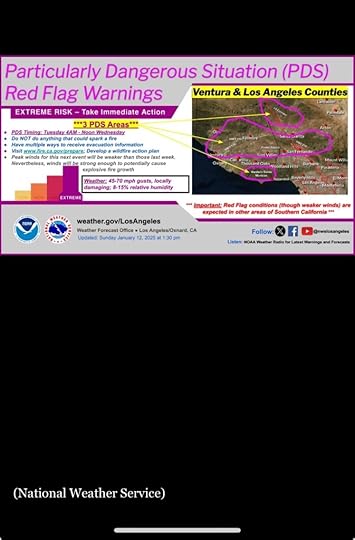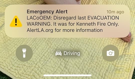Three good friends have lost their homes in Palisades. I was impressed with their reactions. Stoic humor. Cool. Several friends and friendlies have lost homes in Altadena. Displacement high, anxiety high, lots of friends in hotels or friends’ houses or had to leave for a scary night and come back. Dogs in hotels, people evacuating horses. Overall disturbance and on-edge-itude are at high. On Monday the biggest problem in LA was housing. Now there are 10,000 fewer places to live and +10,000 (?) more homeless people.