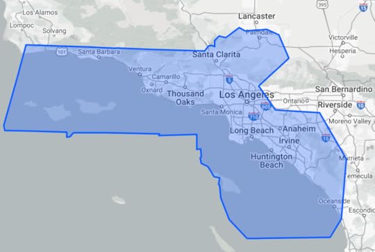 Some remarks in the news etc make me wonder if everyone comprehends the scale of Los Angeles. It’s quite vast. The Palisades Fire and the Altadena fire are about twenty five miles apart, on a straight line, for example. Here’s Massachusetts overlaid on Los Angeles: