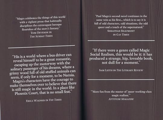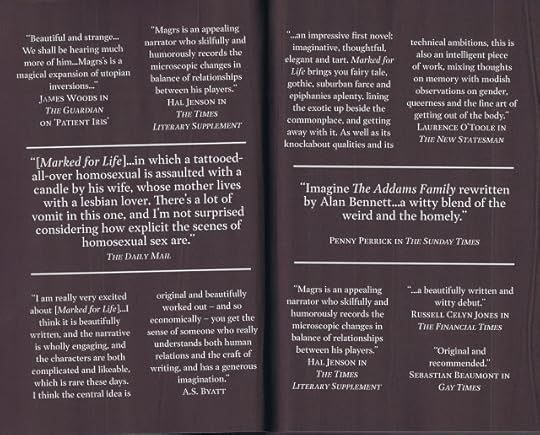 These are quotes from reviews of my first three novels, compiled for the beautiful reprinted editions published by Lethe Press.