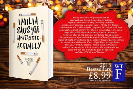 EMILIA SAUSAGE IS FANTASTIC, ACTUALLY by Cassandra Make.Young, attractive TV presenter Emilia has a problem. She is famous for her intense empathy when interviewing incredibly unlikable people on her morning television show – ‘Woke Up, Britain!’ and somehow she is able to make the public fall in love with even completely twattish horrors. Her show is the one that every single despicable public figure desperately wants to appear on. However, what no one knows is that Emilia has a problem. She goes home at night and drinks a bottle of brandy and then she spends all night pretending to be all kinds of hideous people, stirring up trouble on social media. Enter: Nigel Slope, teenage hacker. He’s uncovered the secret of Emilia’s shit-stirring life and he’s threatening to tell all – unless she marries and gives him sex and everything, plus all her stuff, and also a TV show of his own..!