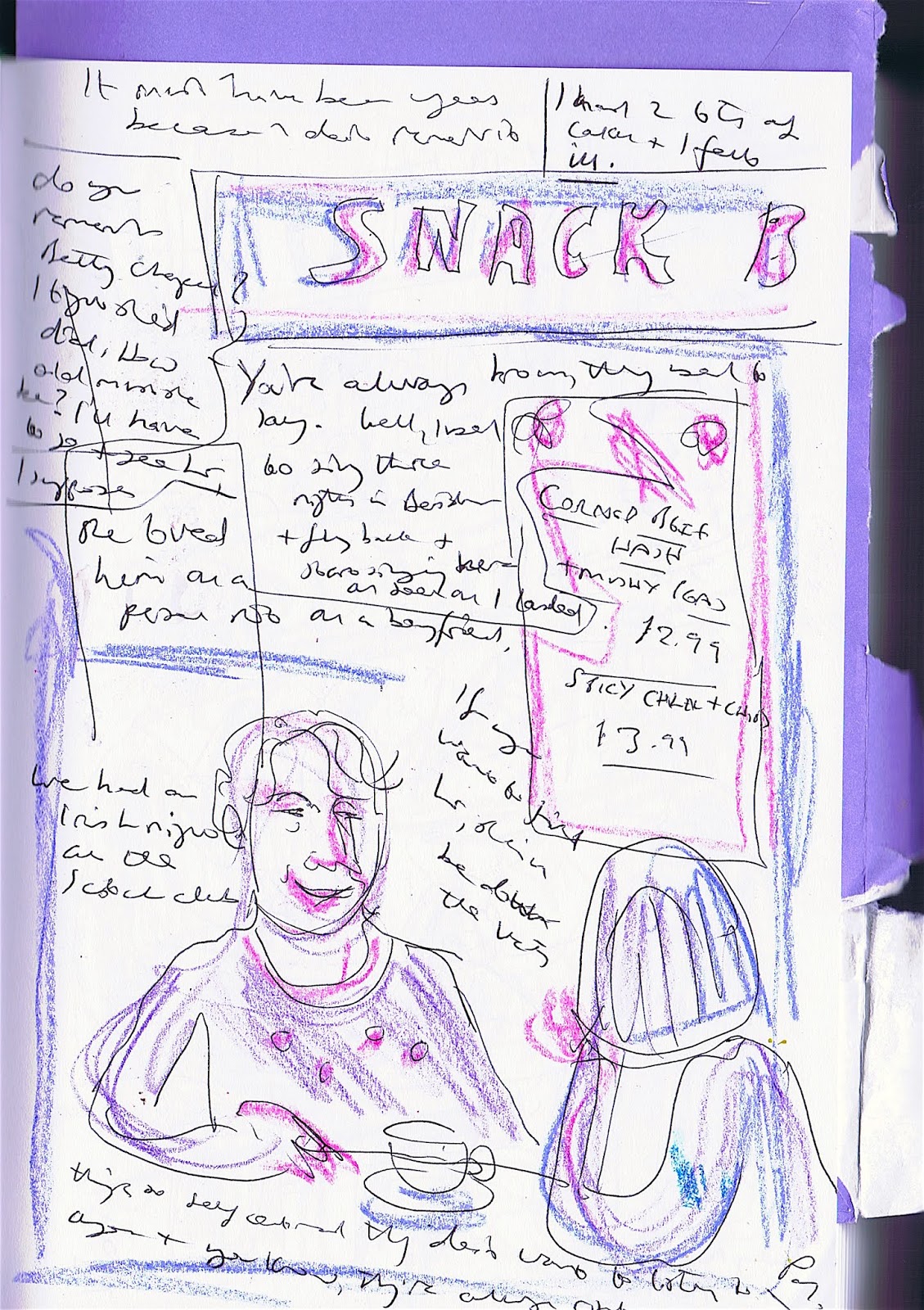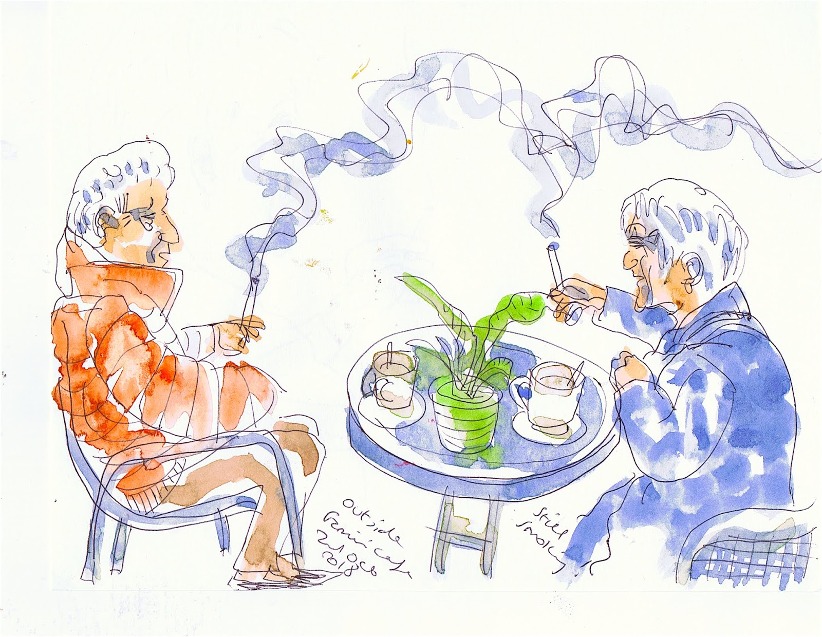 Gemini Café with frothy white coffee. It’s sunny and almost empty, as everyone strides by on the Oxford Road. So, I’ve had my gallery experience, which was mostly just me sitting and writing in my journal. Trying not to notice everyone going by. Towards the end there, when you were looking at the racist wallpaper and the refugee structures the whole place was suddenly swamped by elderly people. There were three coaches parked outside when you left. I’m drawing the old ladies sitting outside Gemini Café. They’re smoking their heads off. Two fellas sitting next to me are saying there’s not so much space round these tables and chairs. ‘Our Elsie would struggle in here, with her leg. Her game leg. Well, at least she’s got one. She’s almost addicted to morphine. They told her: you must be one of the bravest women alive. No, she wouldn’t like it in here, at all.’ With that snatch of overheard dialogue, and nothing to read with me, I’ve covered almost all of the Nine Things. And I guess typing it up and posting this here – it’s almost like sending a letter.